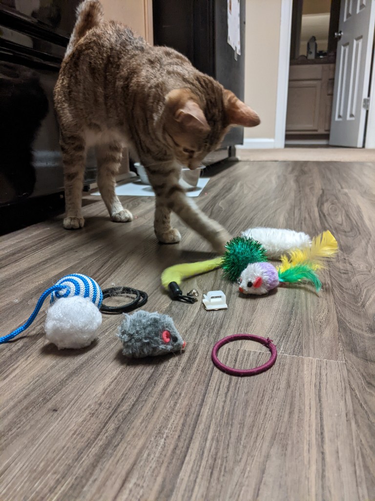 My cat Fern reexamining all the things I found underneath my oven drawer. Out of all the options—all the toys I’d bought her—she chose the smallest bit of cardboard to take out of the pile and play with for the rest of the evening.